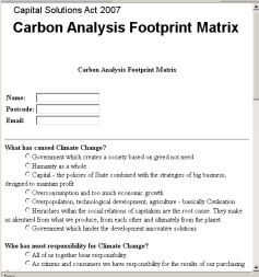 ![]() CARBON ANALYSIS FOOTPRINT MATRIX>TAKE THE SURVEY The survey is as simple multiple choice quiz, asking questions of both responsibility and agency, and it wonders what ideologies are hidden with the language of contemporary debate over climate change. It uses a crude analysis designed to reveal these assumptions in our ideas and feelings about climate change. The results suggest what your ideology is and recommends some texts that represent a different view. The survey asks users for name, postcode and email address. The results are then emailed to me. I intend to collate the responses and display them (anonymously) in the gallery during our time here, and strike up a email conversation with users. You will be awareded a points score out of 100 after taking the quiz but a higher score is not an indicator of correct answers. |